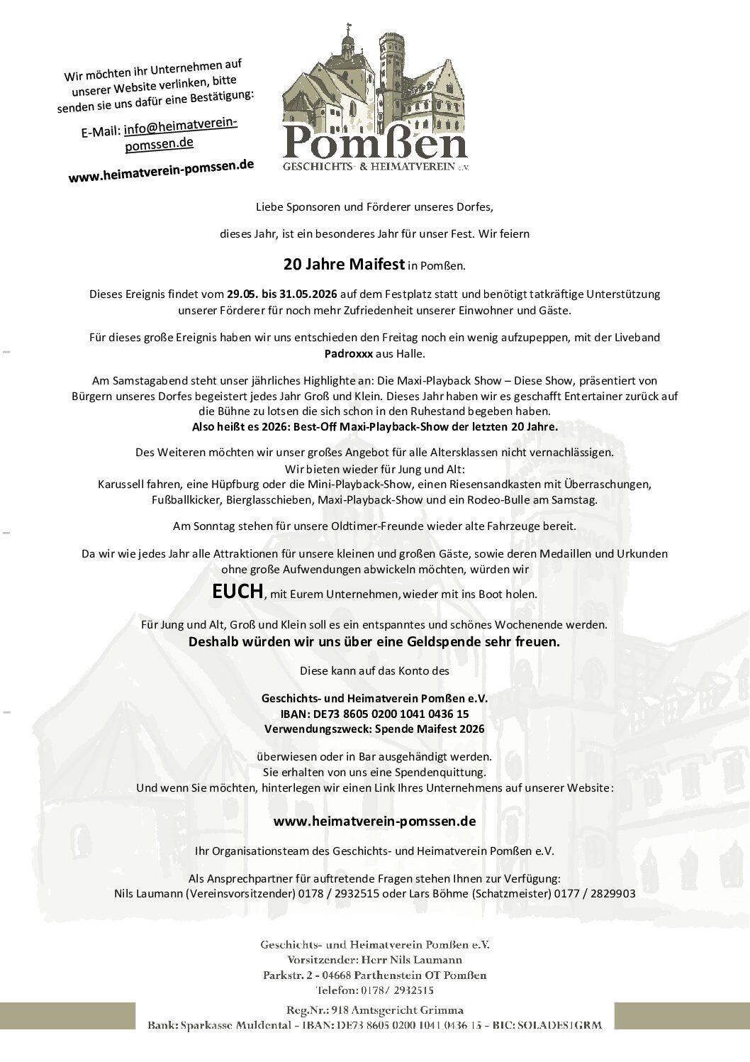 Bald ist es wieder soweit, Pomßen feiert am 23.05.2025 – 25.05.2025 sein Maifest! Alle weiteren Infos folgen…